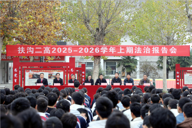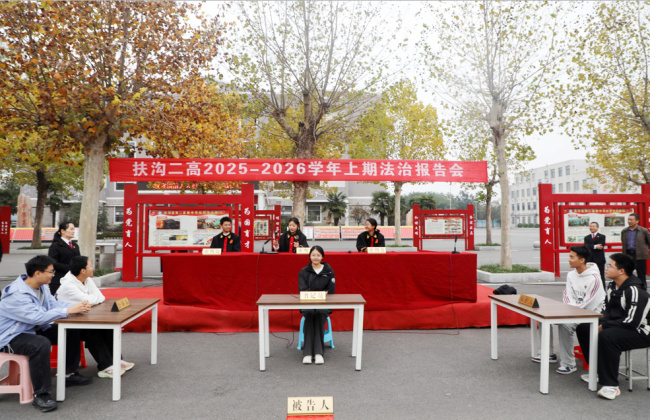 为进一步加强青少年法治教育,提升师生法治意识,10月29日下午,扶沟县人民法院家事庭庭长范娜娜、少年刑事审判庭庭长顾孝勇、副庭长李国会等一行走进扶沟县第二高级中学,为一、二年级全体师生带来了一场内容丰富、形式生动的法治报告会。此次活动以“法律,我们青春路上的‘灯塔’与‘铠甲’”为主题,通过庄严仪式、专题报告、模拟法庭及读本发放等多种形式,在校园内营造了尊法、学法、守法、用法的浓厚氛围。