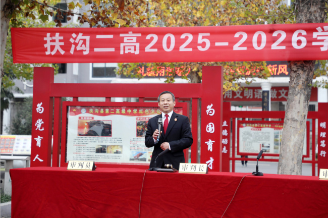 扶沟二高校长魏国营在致辞中勉励全体同学以法为灯,明辨是非,将法治信仰深植心间;以法为翼,奔赴光明未来,努力成长为有温度、有锋芒、有担当的新时代青年。