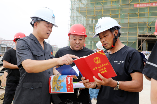 活动首站,干警们来到了某建筑公司的项目工地。脱下法袍,戴上安全帽,法官们走进了喧闹而有序的施工一线。他们利用工友们的休息间隙,围绕《中华人民共和国民法典》、《劳动合同法》等与工人们生产生活密切相关的法律法规,进行了面对面的现场宣讲。法官们用通俗易懂的语言,结合真实案例,重点讲解了劳动合同签订、工伤认定与赔偿、工资报酬支付、安全生产责任等工友们最关心、最直接、最现实的法律问题,并耐心解答了大家的现场咨询。这种“拉家常”式的普法,让枯燥的法律条文变得鲜活起来,赢得了工友们的阵阵掌声。