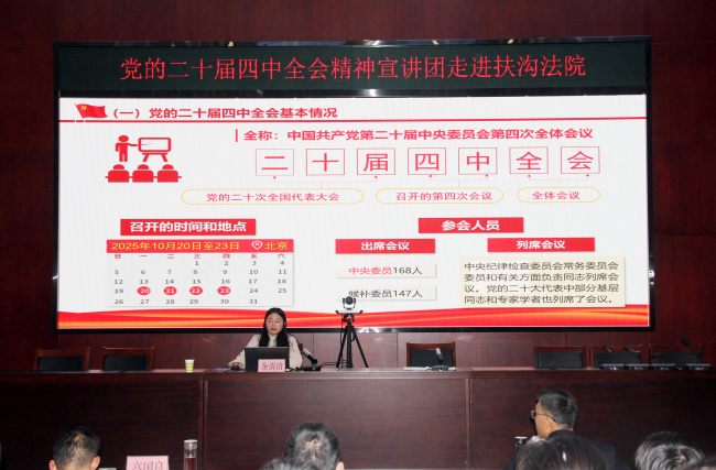 余清清老师结合扶沟县发展实际和法院工作实际,对全会提出的重要思想、重要观点、重大举措作了深入浅出的讲解。她强调,要深刻领会全会的核心要义,准确把握新时代新征程党的使命任务,切实把思想和行动统一到党中央决策部署上来,把学习成果转化为服务大局、司法为民、公正司法的生动实践。